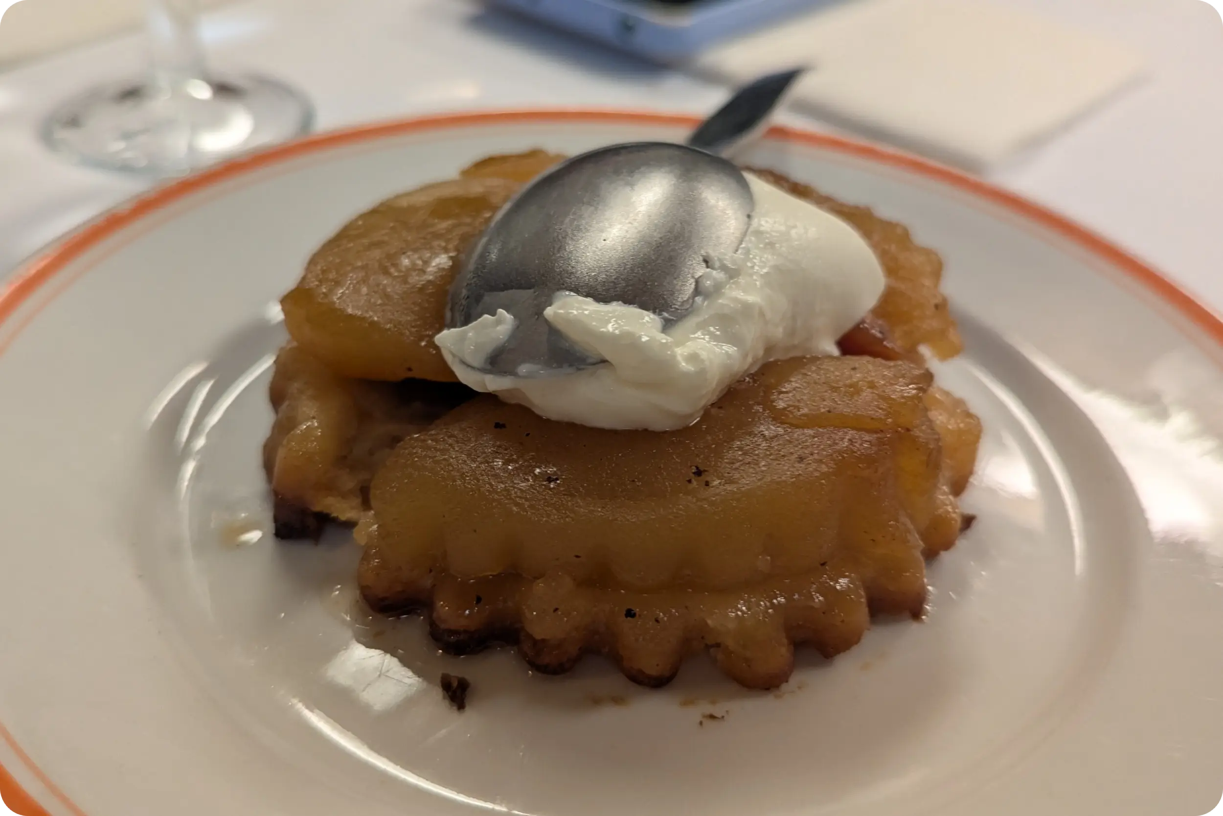 En dessert, les suggestions s’agrémentent des noix du jardin du papi de Paola. Du local et du familial : c’est tout ce qu’on aime ! À vrai dire, les portions ont été jusque-là si généreuses que l’appétit vient à manquer : coup dur pour la Compagnie ! Nous finissons tout de même par attaquer fièrement des crèmes caramel et une tarte tatin pour les becs à sucre les plus tenaces d’entre nous. Jusqu’à la fin du repas, tout est un délice ! Cela nous conforte dans l’idée que la cheffe sublime son office derrière les fourneaux d’une mère lyonnaise.