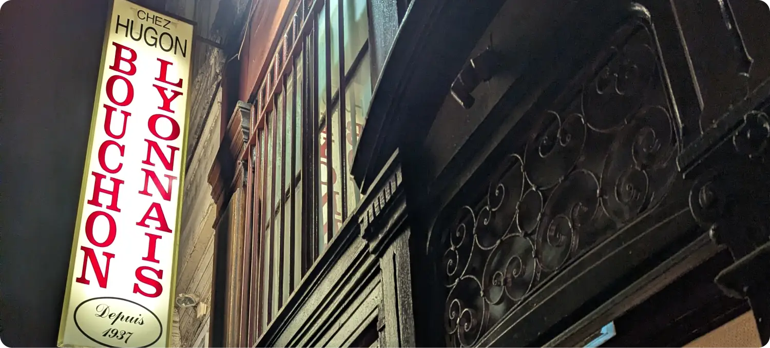 Ce bouchon Chez Hugon est situé au 12 rue Pizay 69001 Lyon, en plein cœur de Lyon France, entre Presqu’île et pentes. Cette adresse centrale, proche des axes animés, en fait un lieu authentique très recherché parmi les restaurants à Lyon, aussi bien par les habitants que par les visiteurs du monde entier.